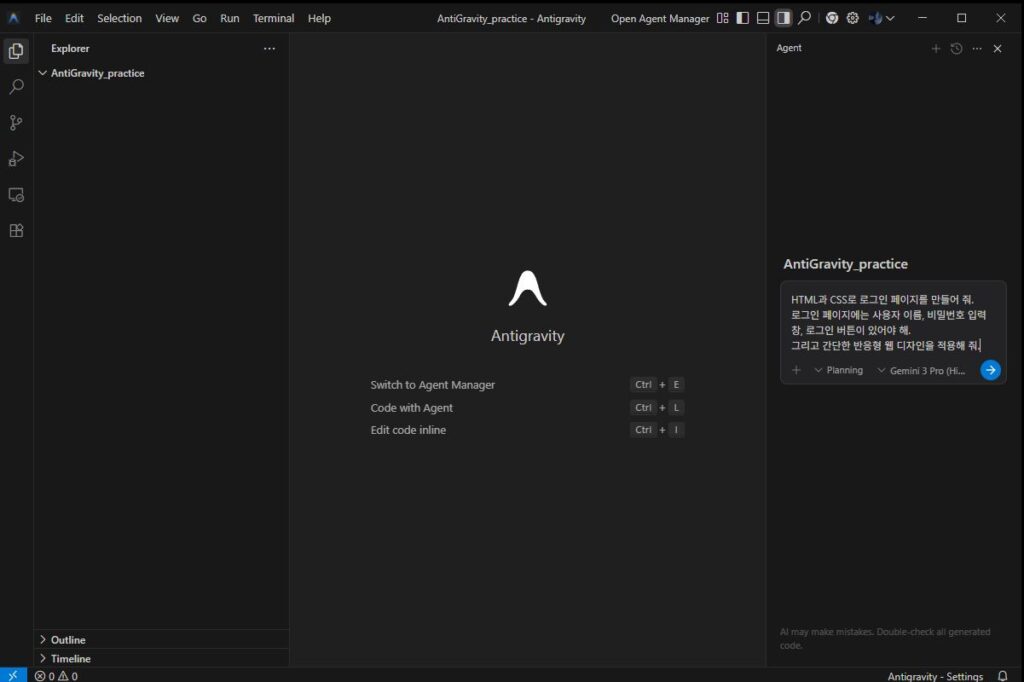 - Antigravity는 멀티스텝 처리 가능 → 화면 구성, 반응형, 코드 테스트 일부 자동화