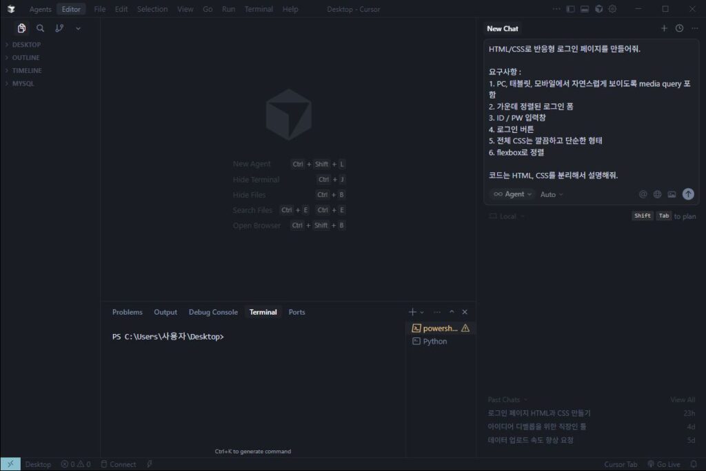 Tip) 저도 개발자다 보니 Cursor는 유료 Agent 버전을 사용하는데요. 오늘은 그래도 명확한 비교를 위해서 로그아웃 후 다른 계정으로 접속한 무료 버전을 가져왔습니다.